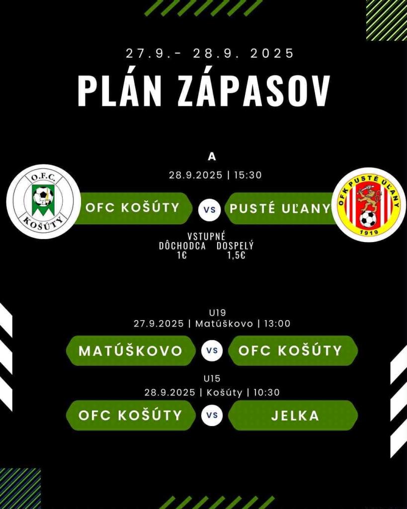 27.09.2025 o 13:00 hod. U19 Matúškovo - OFC Košúty 28.09.2025 o 10:30 hod. U 15 OFC Košúty - Jelka 28.09.2025 o 15:30 hod. OFC Košúty - Pusté Úľany